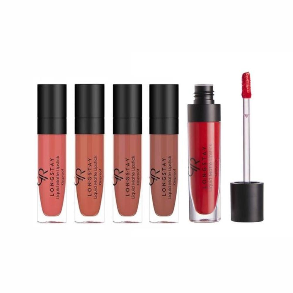 5 ارواج قولدن روز من اختيارك من الخيارات المميزة لدينا بفضل تركيبتها طويلة الثبات لتدوم لساعات طويلة دون الحاجة لإعادة التطبيق، وهي مقاومة للتلطيخ والتآكل ما يجعلها مناسبة للاستخدام اليومي أو السهرات الطويلة، يأتي بقوام سائل ناعم سهل التوزيع بشكل متساوي على الشفاه باستخدام فرشاة التطبيق المصممة بدقة، يمنحكِ لمسة نهائية مات دون الشعور بالجفاف.